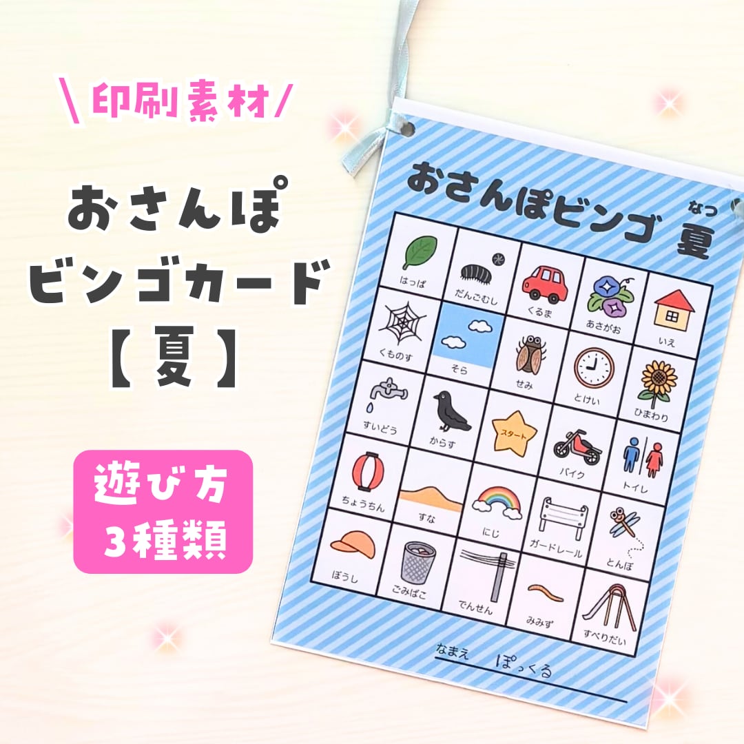 ・ビンゴカードを持って外へお散歩に行きましょう。ビンゴカードに描かれているイラストと同じものを見つけたら丸をつけます。1列そろったらビンゴ!